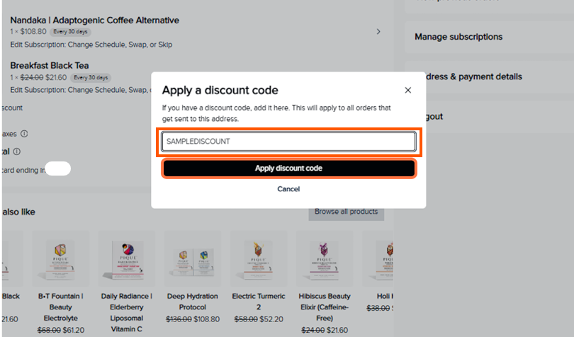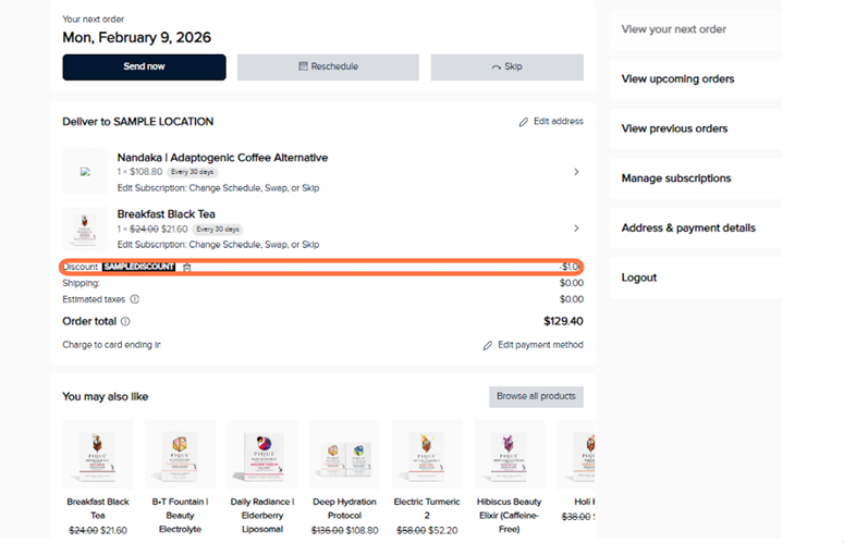 - Discount codes or subscription updates must always be applied before your shipment date, as orders are processed early in the morning on that day. • Changes made on the same day may not apply to that shipment.