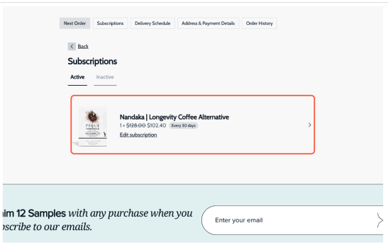 - Log in to your subscription manager account. You can access this through our confirmation emails, or by logging into your account on our website and clicking SUBSCRIPTIONS.