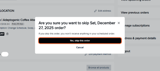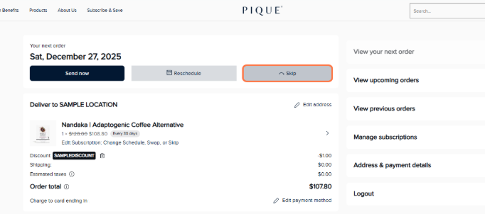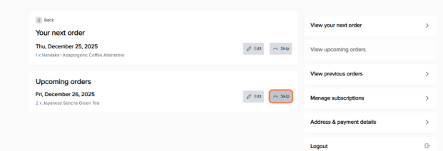 - To skip your next order, click Skip.