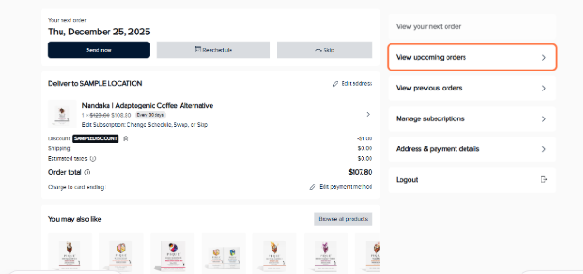 - To skip a future shipment (not the upcoming one), click on View upcoming orders.