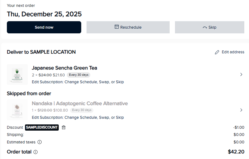 - All subscription items must be managed individually. Skipping one product does not change or cancel the others in your subscription.