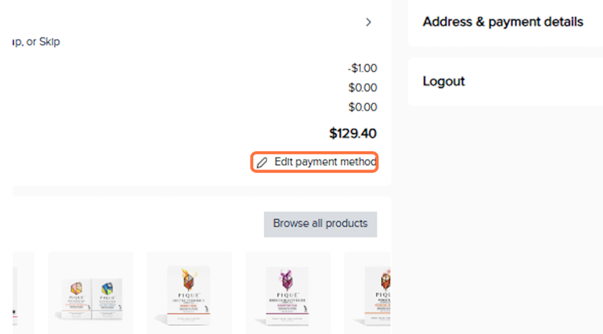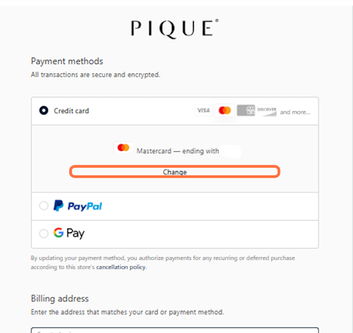 - Pique orders are processed early in the morning, so if the payment method on your account is not updated before the processing date, your order will be charged using the previous payment method on file.