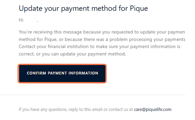 This will send an email to your inbox from Pique with the subject line: “Update your payment method for Pique.”