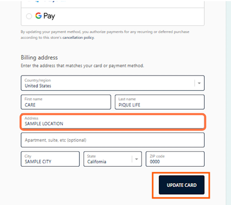 - Enter your billing address. Make sure it matches the address on file with your card issuer. Click “Update Card” to save your changes.